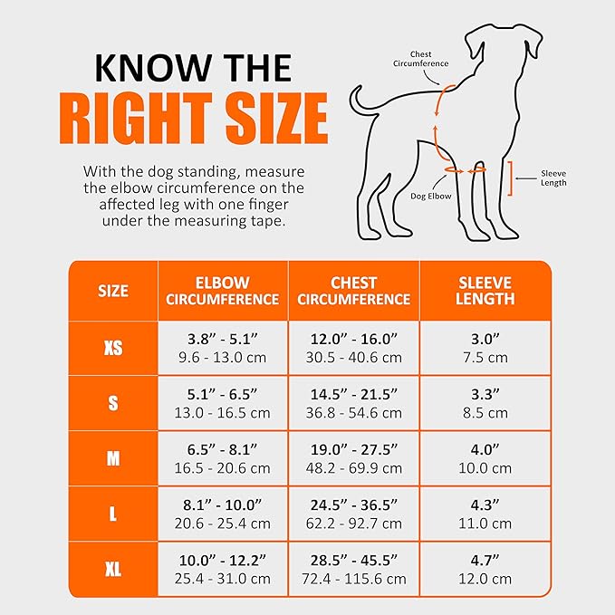 - HOW TO MEASURE: Measure the leg circumference at the elbow on the affected leg and follow the size chart (above) to choose the correct size for the left or right leg (stand behind your dog to tell left or right)