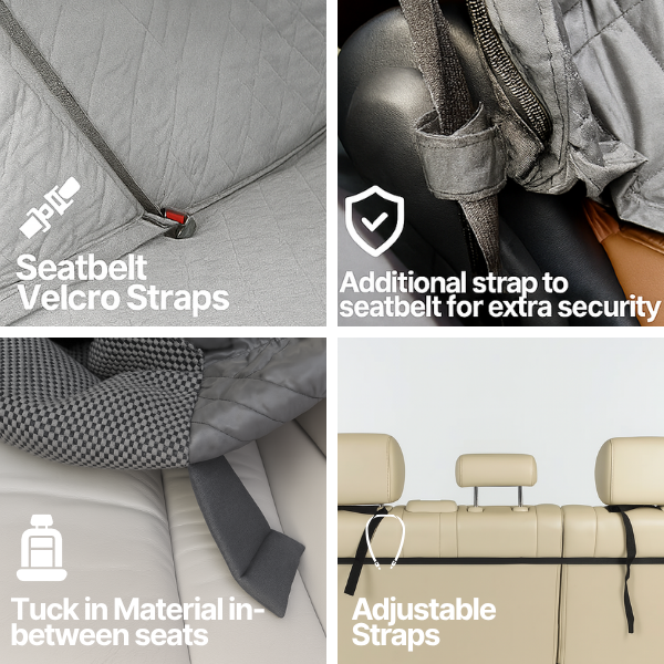 Whether you’re taking your pup to the park or on a road trip, this dog back seat protector installs easily and stays in place with five secure attachment points — including headrest and seat belt straps, tuck-in side panels, and a rear backrest strap. Velcro seatbelt openings allow access without removing the cover.