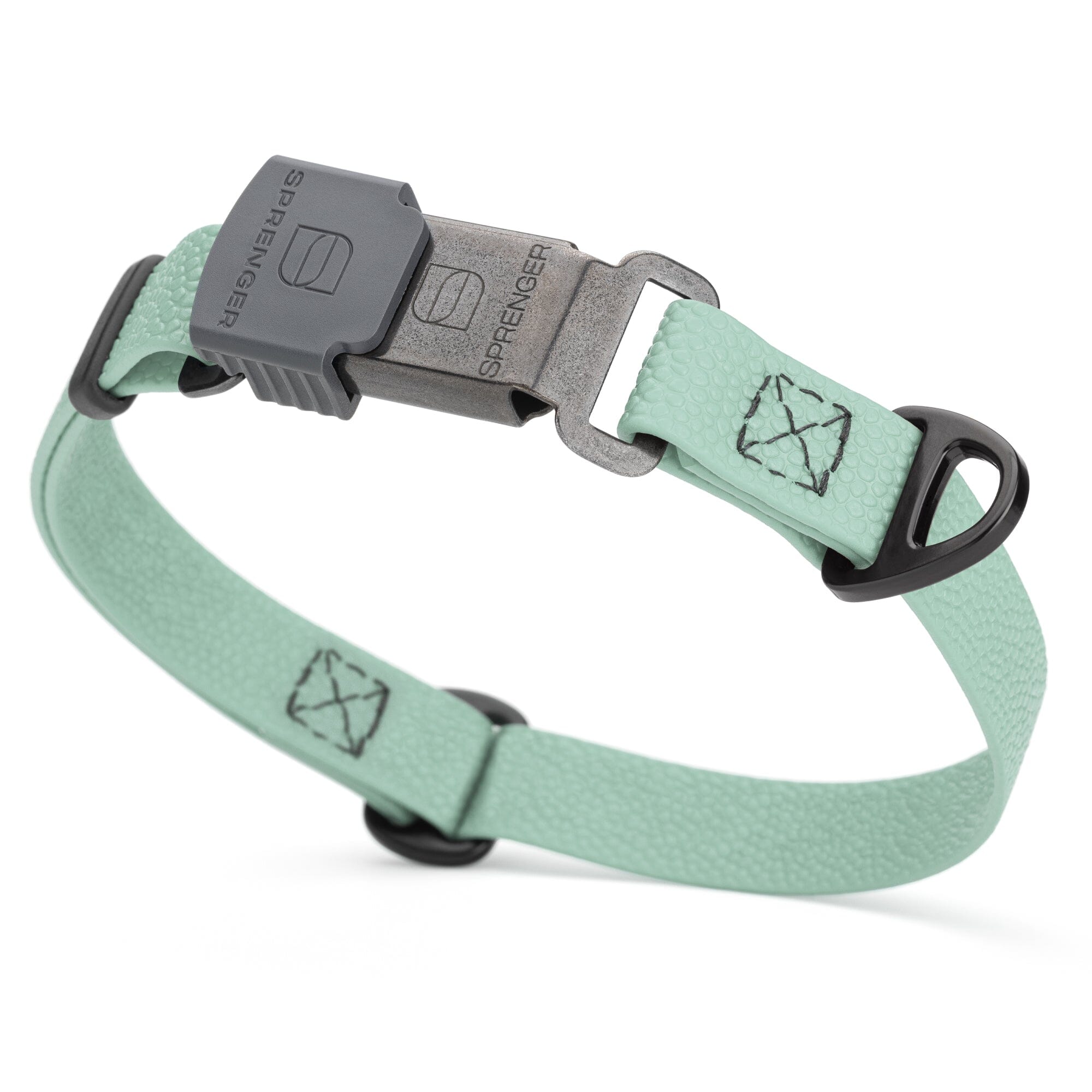 The pebble embossed dog collar is made from the authentic Biothane waterproof coated webbing with an anti-slip, pebble textured surface that provides a comfortable grip, and heavy duty waxed thread stitching. The fully waterproof coating protects against staining, discoloration and excessive dirt. Your four legged friend will be able to jump through puddles, swim in lakes, play in the snow or rain without the hassle of cleaning!