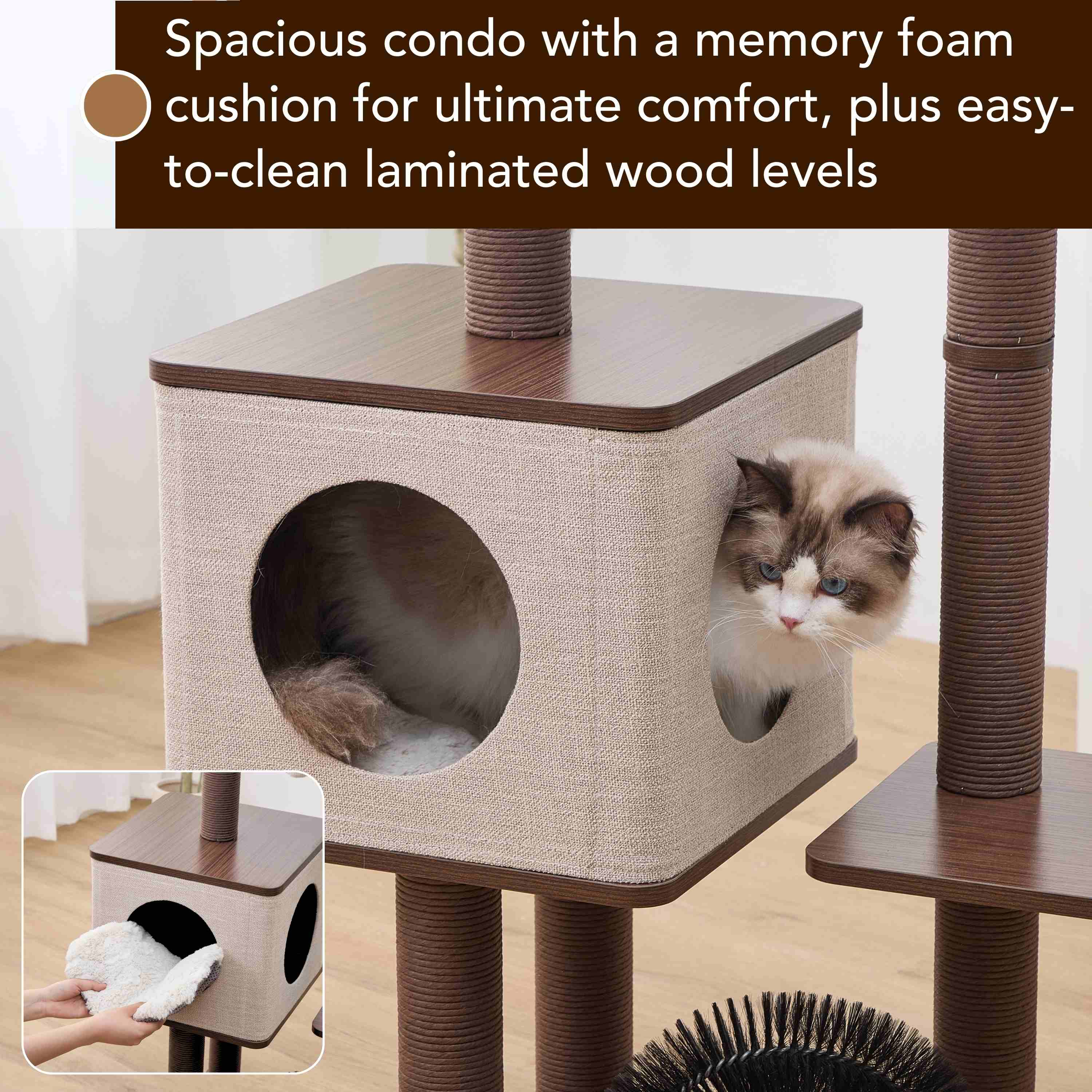 - Easy-to-clean laminated wood levels with washable bed and condo cushion