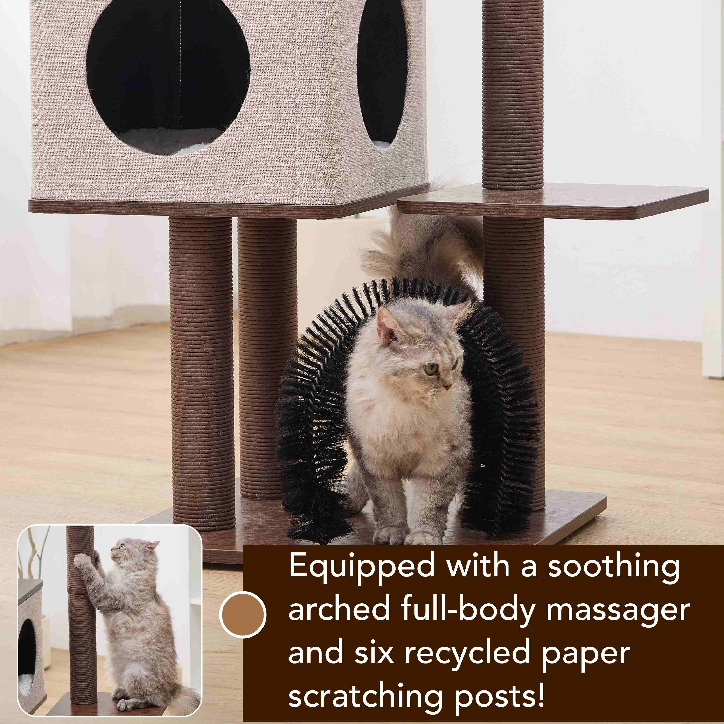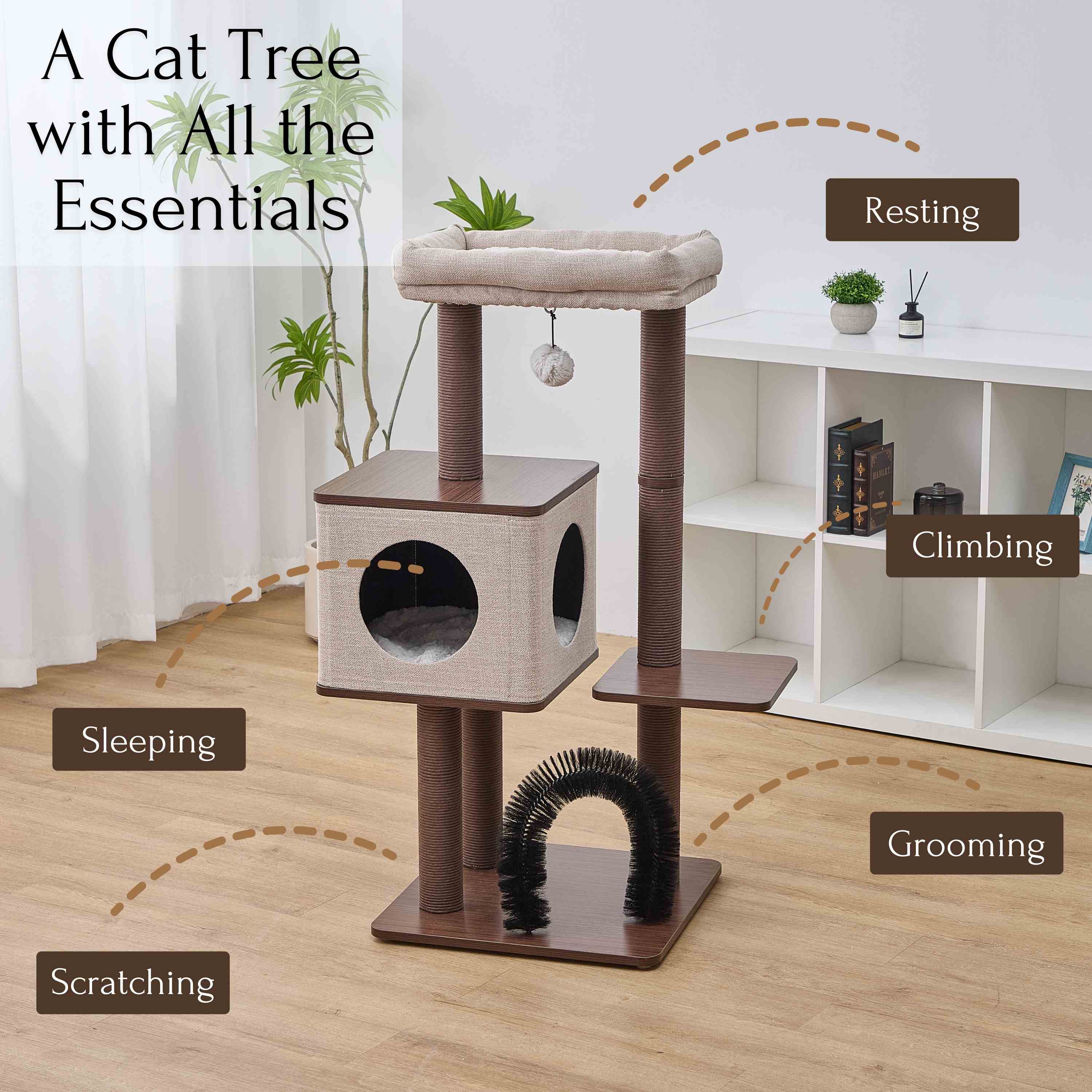 Discover the PetPals® Elevate 2.0 Cat Tree—where modern design meets feline wellness. With four levels crafted from sleek, laminated wood, this tree encourages cats to jump, stretch, and stay active while blending seamlessly with your home’s aesthetic. The six recycled paper rope posts support natural claw care, helping protect your furniture over time. A plush washable bed and linen condo cushion provide cozy rest spots that are easy to clean and maintain. Featuring an interchangeable toy for mental stimulation and a full-body arched massager to ease stress, Elevate 2.0 offers a multi-sensory experience your cat will love. Perfect for medium-sized cats, this tree is part of our Mid-Century Modern Collection, designed to support both your cat’s health and your home’s style.