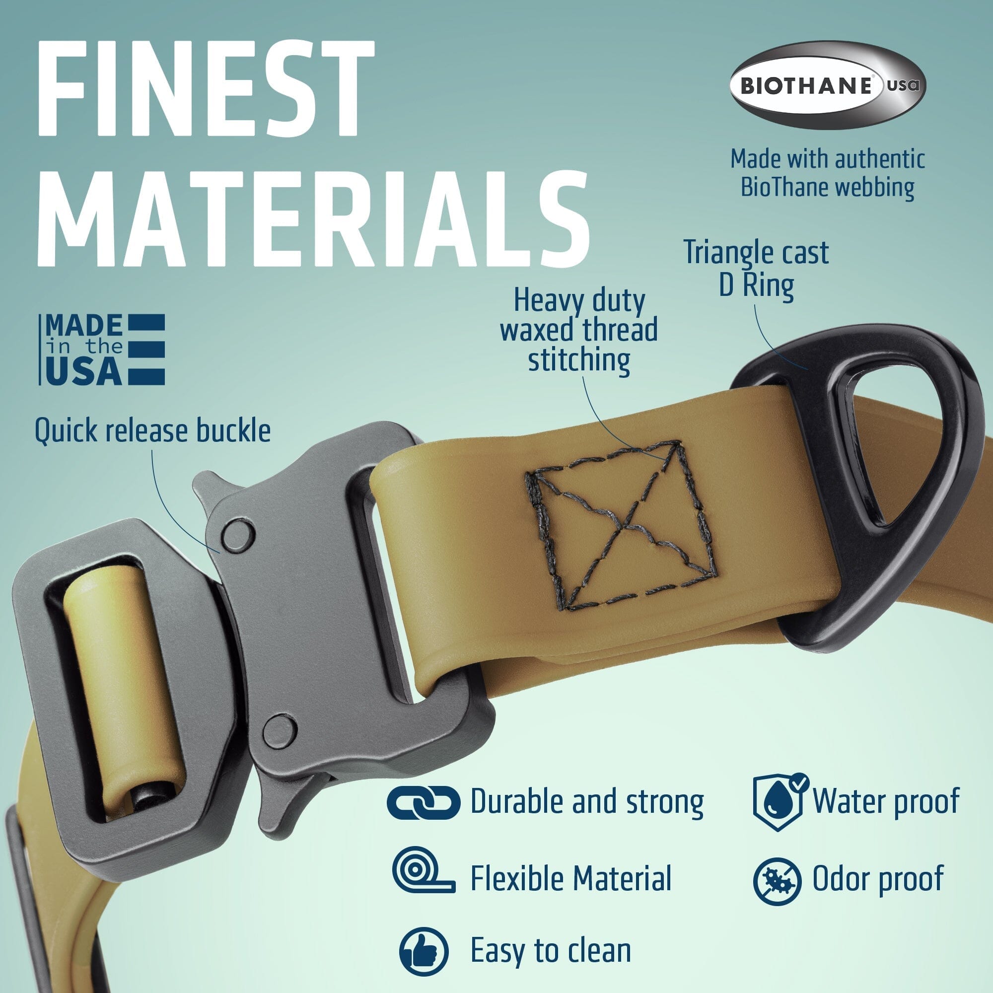 The BioThane webbing with water- and odor proof coating of this quick release dog collar withstands rain, snow, brackish waters, beach playtime and hiking without absorbing any moisture or dirt. Biothane material is easy to clean with a wet cloth or simple water rinse.