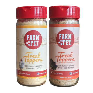 Farm to Pet Treat Toppers give any pet’s diet a nutritional boost! Made from our healthy pet treats and always free from anything artificial, these tasty pet food supplements support muscle development, healthy skin and coat, and overall well-being as they enhance meals, recipes and more. Our Topper Combo Pack includes two tastes that dogs - and cats! - love: all-natural chicken and turkey.