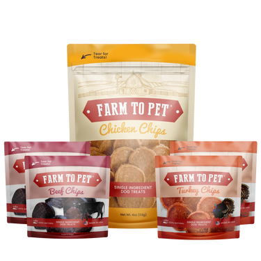 Our Puppy Packs healthy dog treat bundles are an ideal way to kickstart your puppy's healthy lifestyle! Farm to Pet Beef, Turkey & Chicken Beef Chips provide the pure nutrition of single-ingredient protein needed for healthy growth and energy levels. These excellent on-the-go snacks are always free from additives, preservatives, or artificial ingredients and provide puppies nothing but the wholesome nutrition they deserve.