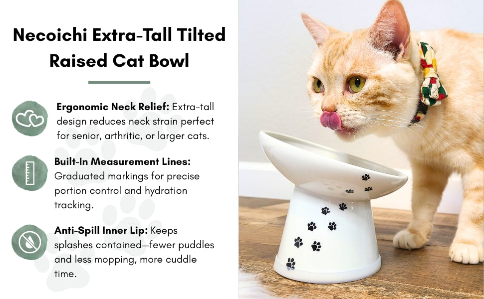 - Perfect Height & Size: Necoichi’s largest raised cat bowl measures 6.1" x 5.7 in diameter, 5.3" in length, and 1.8" in depth, weighing 1.2 lbs. Additionally, the 15-degree lifted cat bowl makes mealtime comfortable and stress-free for your cat.