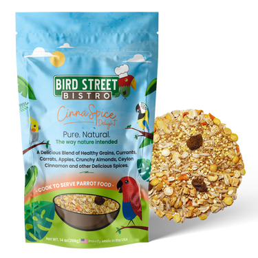 Wondering what to feed your parrot? Start with organic, all-natural ingredients and flavors that they love! The CinnaSpice parrot food blend is thoughtfully crafted with nutrition in mind. Like all Bird Street Bistro products, it’s made without any fillers, additives, sugar, salt, or artificial ingredients. Every bite is packed with healthy organic grains, fruits, and vegetables that are packed with protein, fiber, and vitamins. The dried blend boils and simmers in just 15 minutes. As it cooks, enjoy the vibrant scent of organic coconut, cinnamon, apple, and sweet-spicy anise seed! It’s ready to serve after five minutes of cooling and can be frozen for a week of convenient meals. Encourage your bird’s wild foraging instincts with flavorful, bite-sized ingredients and crunchy almonds that add a textural surprise.