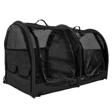 Pop-Up Kennel - medium, double with split vinyl/mesh doors (aka Show Shelter double) is preferred by many Pet Exhibitors who are looking for a balance of visibility and ventilation. No assembly is required. Simply remove from the case, give it a shake and it pops open! Mesh doors for maximum ventilation. Great for use at home, in hotels and on the road! (comfort pads and other accessories that appear in some photos are sold separately)