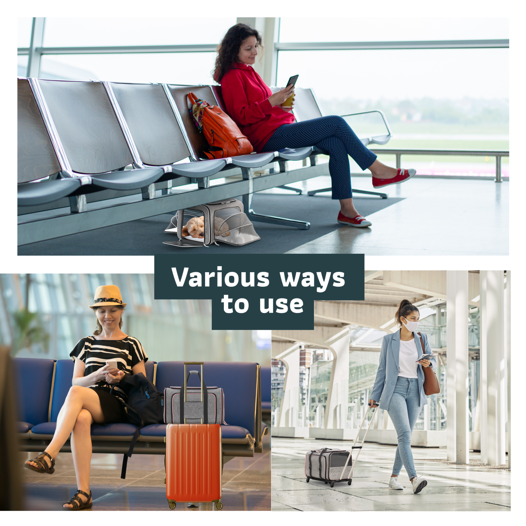 FEATURES & BENEFITS: Removable Wheelbase Easy Swivel Rubberized Wheels x 6 Soft Sided Pet Carrier Double Telescopic Hand Washable Plush Bed Inner Safety Leash Hook Zippered + Storage Pockets Comfort Strap Handle