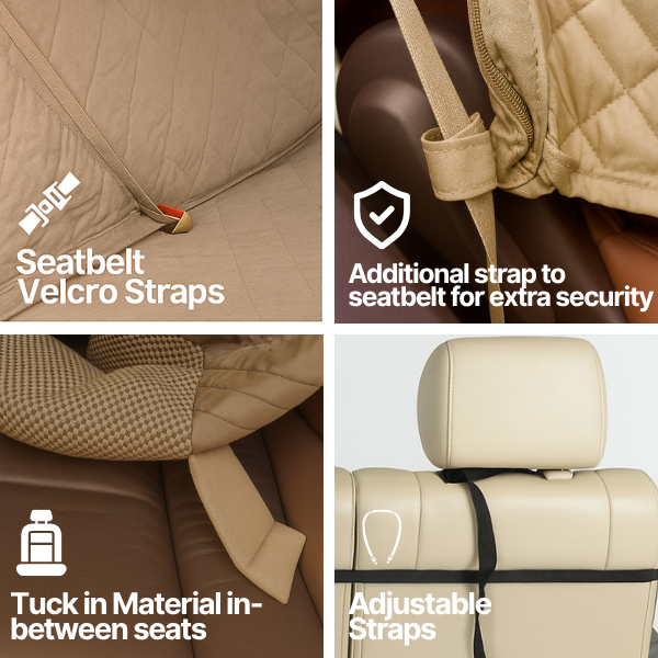 This water-repellent, quilted pet seat protector is designed for the front or rear single seats of most cars, trucks, and SUVs. It’s made from thick, padded woven polyester with a durable 75D backing — giving it a premium look and feel while shielding against scratches, dirt, shedding, and pet accidents. Ideal for daily errands, road trips, or trips to the vet, this dog car seat cover stays securely in place with adjustable buckle straps that attach around the headrest and seat base.